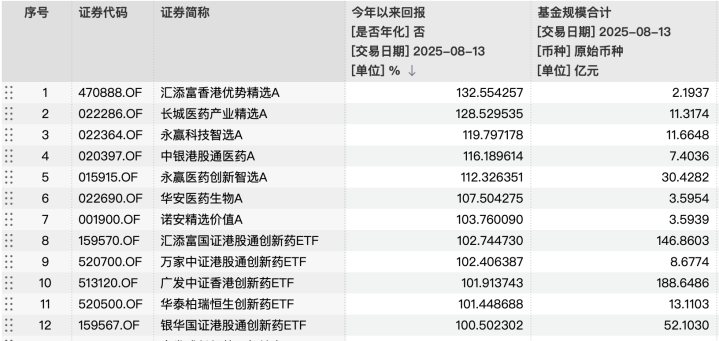此外,医药、港股、科技等赛道的基金产品收益大多靠前。收益前十的基金产品其名称中多明确关联医药、港股、科技概念。